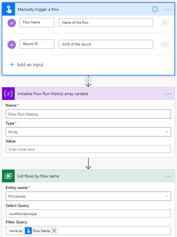 The sample solution flow is triggered manually but you can extend it and set it up as a recurrence flow and have it notify you of any failure in a shorter timeframe (e.g. hourly) for mission-critical flows instead of relying on the weekly emails. The first parameter is the name of the flow and the second one is the GUID of the record. You can get the GUID of the record by using the "Record ID" action from the Level Up browser extension by Natraj Yegnaraman or copy the GUID value after "id=" parameter in the URL in Unified Interface.