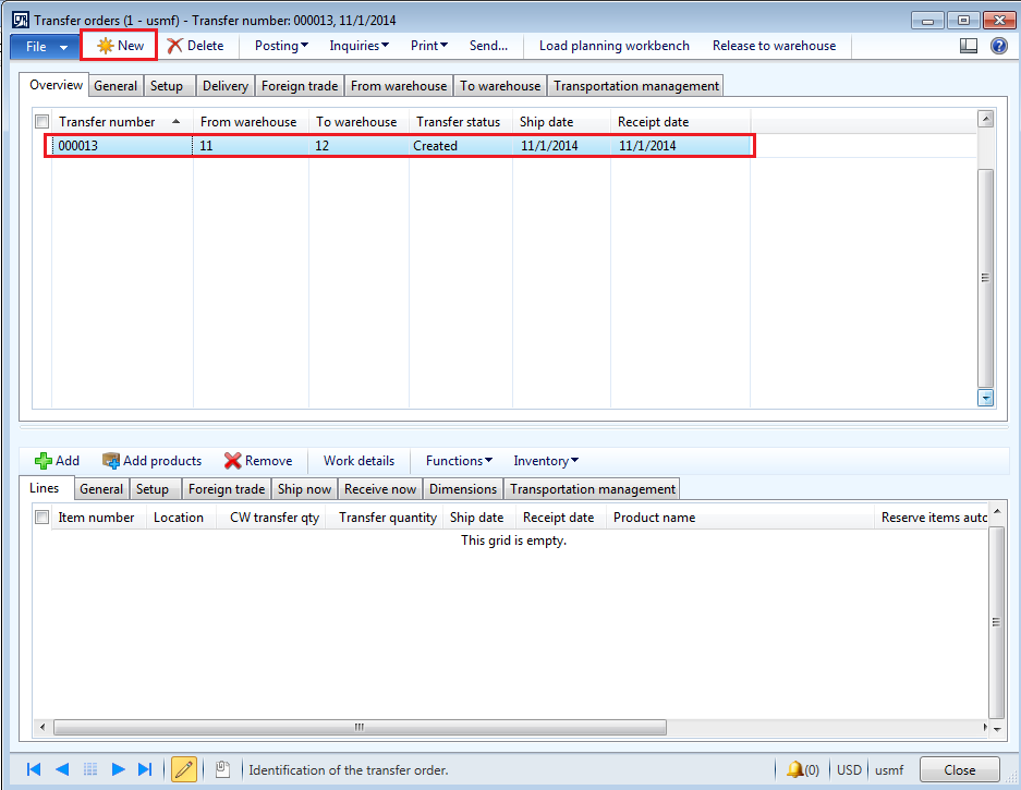 5. In the lower pane, add: Item numbers, Transfer quantities.