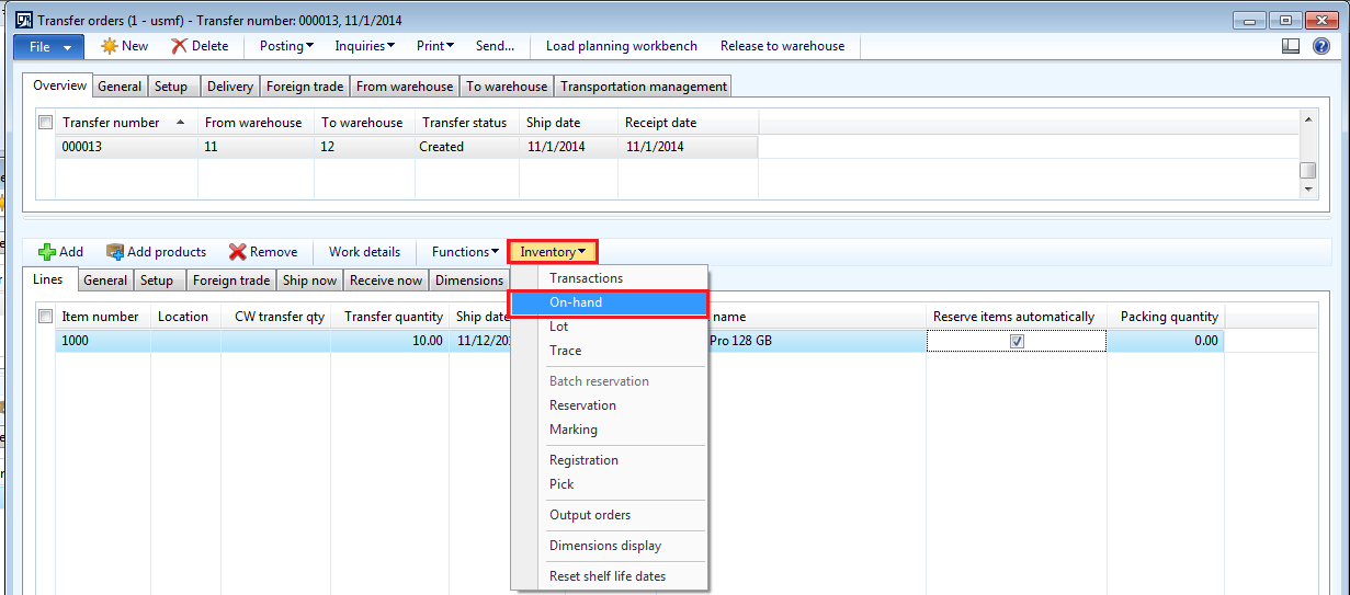8. Click on inventory --> On hand to check the quantity available in the originating warehouse (From warehouse) before the picking process starts.