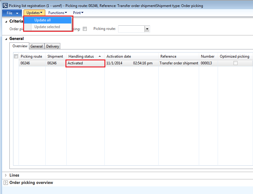 A. If the Picking route status in inventory and warehouse management parameter is "Completed" then the "Handling status" in picking list registration will automatically goes in completed state.B. If the Picking route status in inventory and warehouse management parameter is "Activated", then picking process need to be activated and completed manually.