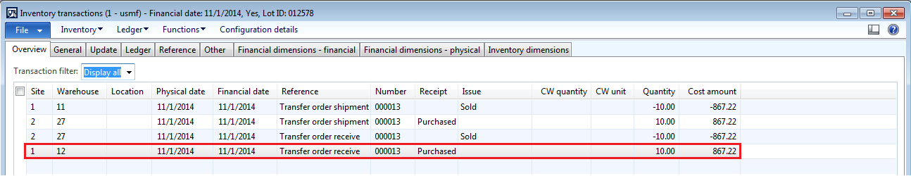 31. Go to transfer order lines--> Select the item --> Click on inventory --> Click on Transactions to check the inventory effects.