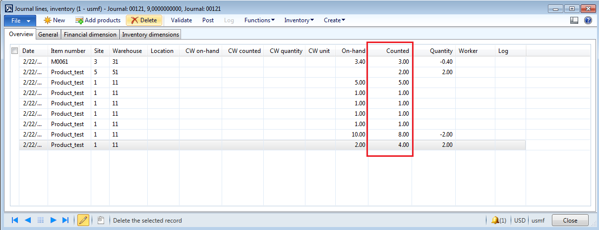 12. Once items come in the counting journal lines with their On-hand inventory, Add actual physical count of those particular items in the "Counted" field.