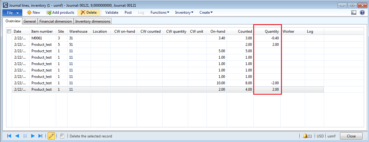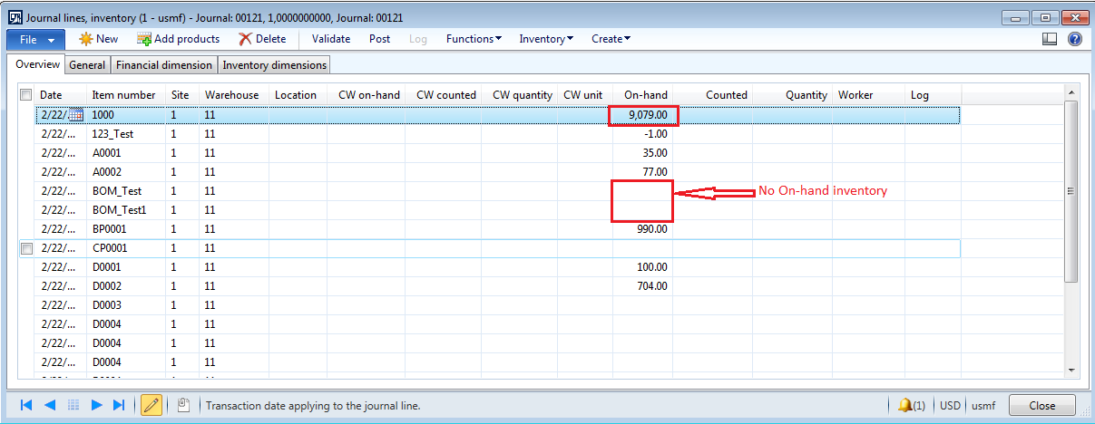 3. Based on the storage and tracking dimensions combination selected over here, AX provides On-hand inventory count in the journal for the particular item.