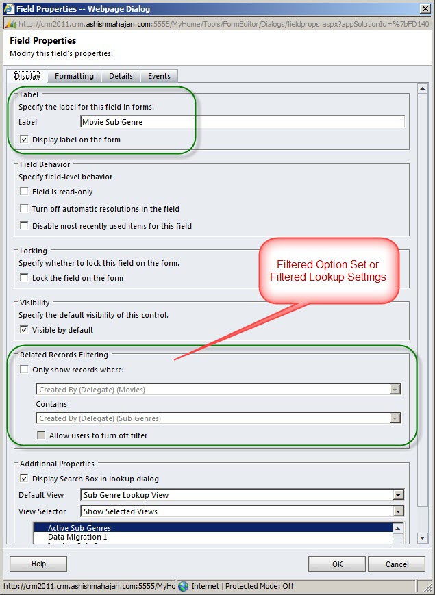 9) This will open the "Field Properties" window for the sub genre lookup field. Check out the marked area below which states "Related Records Filtering". This is the section where we configure a filtered lookup.
