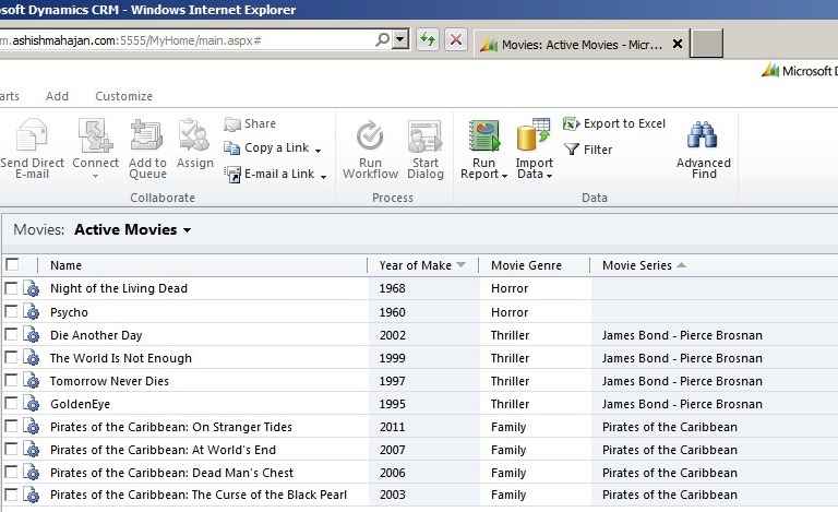 7) I will configure a sub genre lookup field so that it filters based on the selected genre. Click "Customize Entity" under "Customize" tab to customise Movies. This will open the Movies form in design mode.