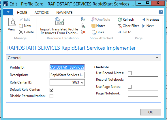 - Configure RapidStart Service Wizard by enabling the default Role Centre of RapidStart Services Implementer in Profiles.
