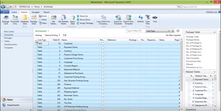 - In the Configuration Worksheet, select all the tables with required fields and filters and assign it to the package.