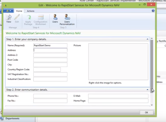 - Click on the RapidStart Services Wizard and enter the Company Information, communication details, payment details.