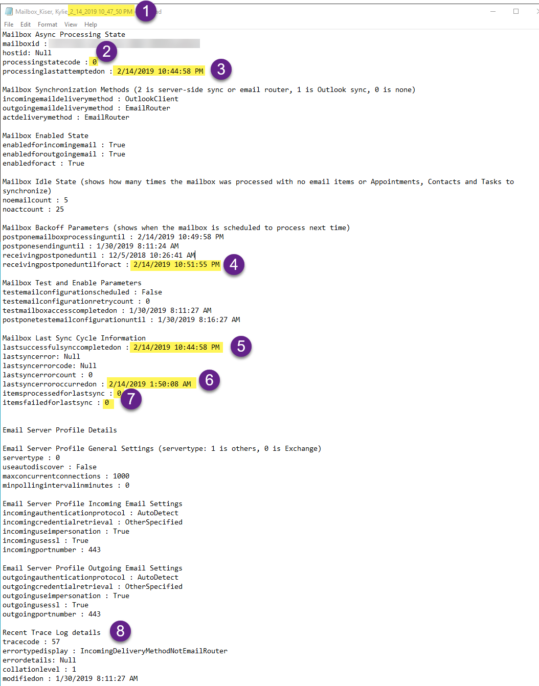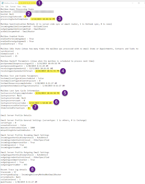 When reviewing a specific Mailbox inside of Dynamics 365 there is a button on the ribbon to "Download Mailbox Details". This gives you a lovely file of information you do not know how to read. So here is what I learned about this file through the process.