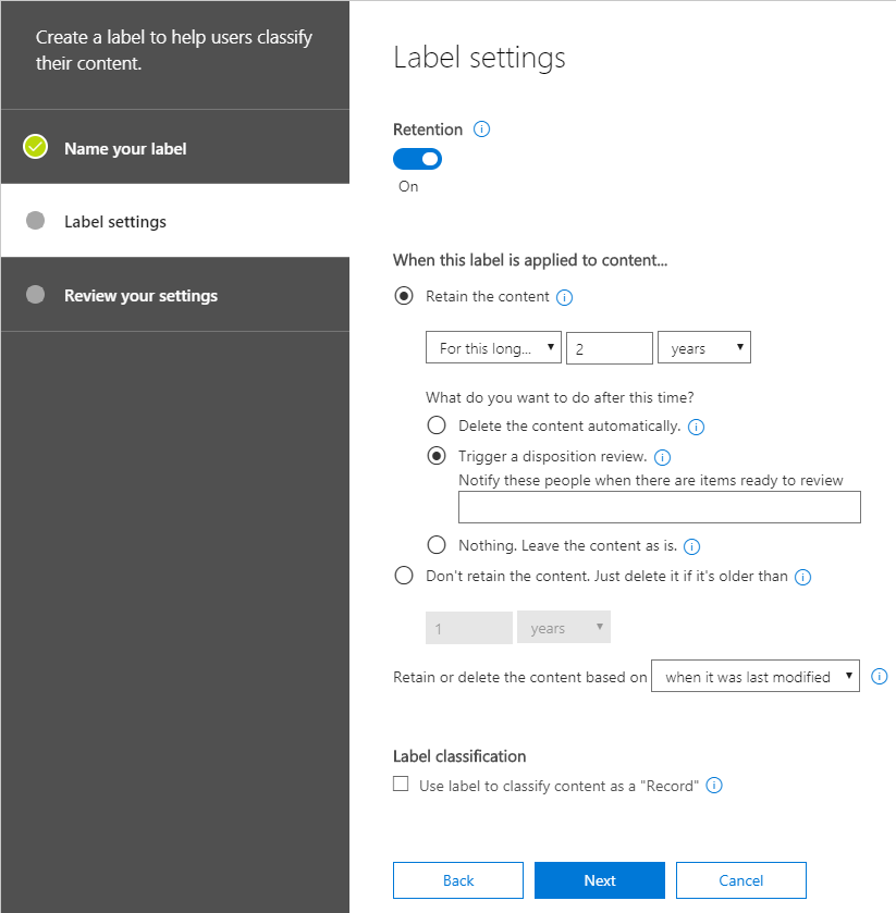 On this screen, I chose to turn on retention, and to set the retention period to be 2 years, starting from the last time the content was modified. I also wanted to trigger a disposition review, instead of just deleting it automatically or keeping it as it was.