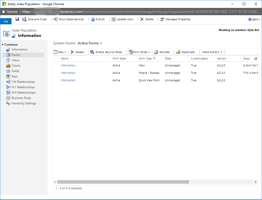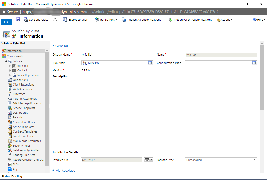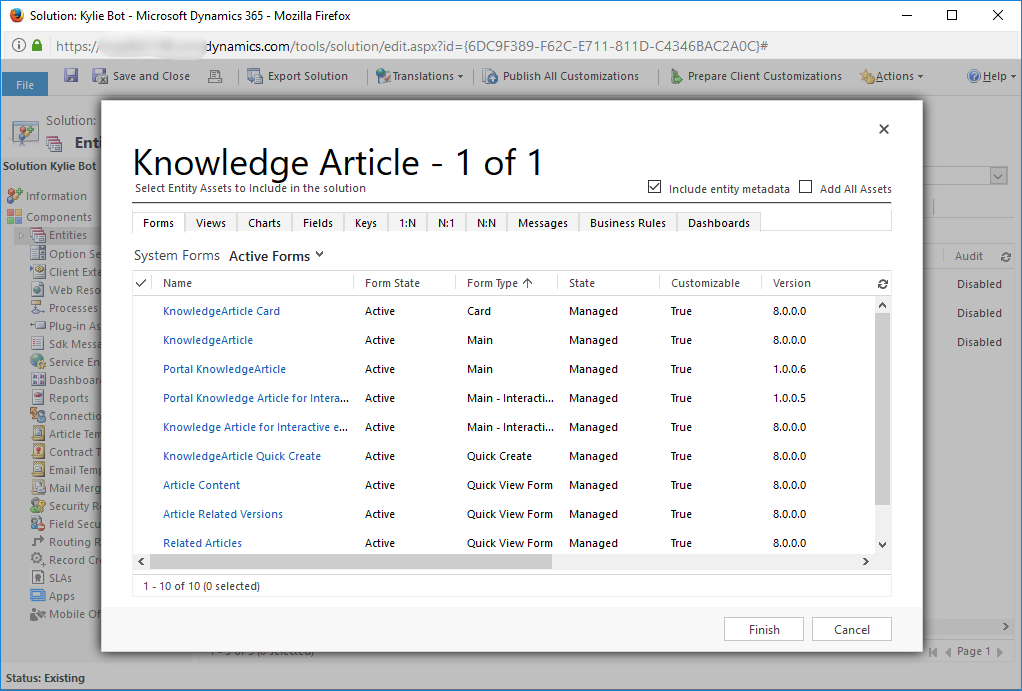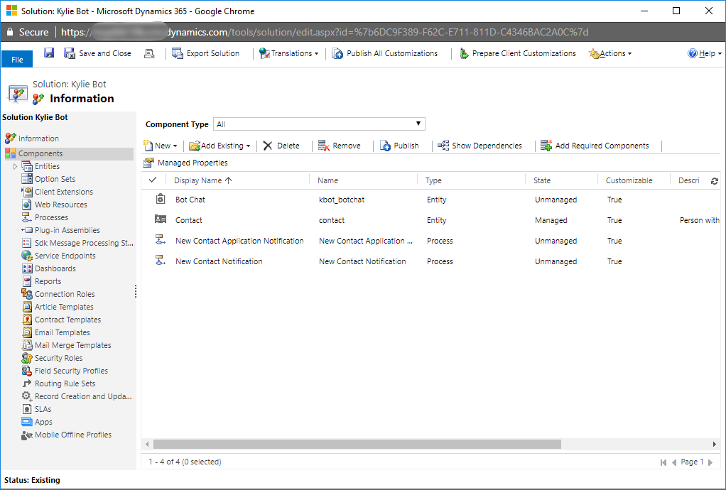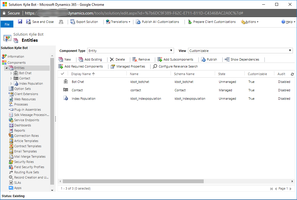 Here, you should have a solution called ‘KylieBot’ or similar from where we have been making our changes to our Dynamics 365 Customer Engagement instance. The original solution came from this blog post. Your screen should look like this: