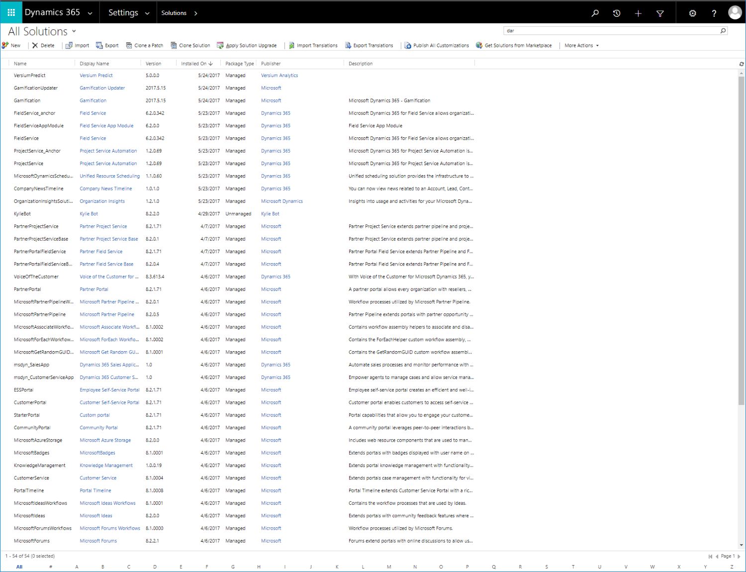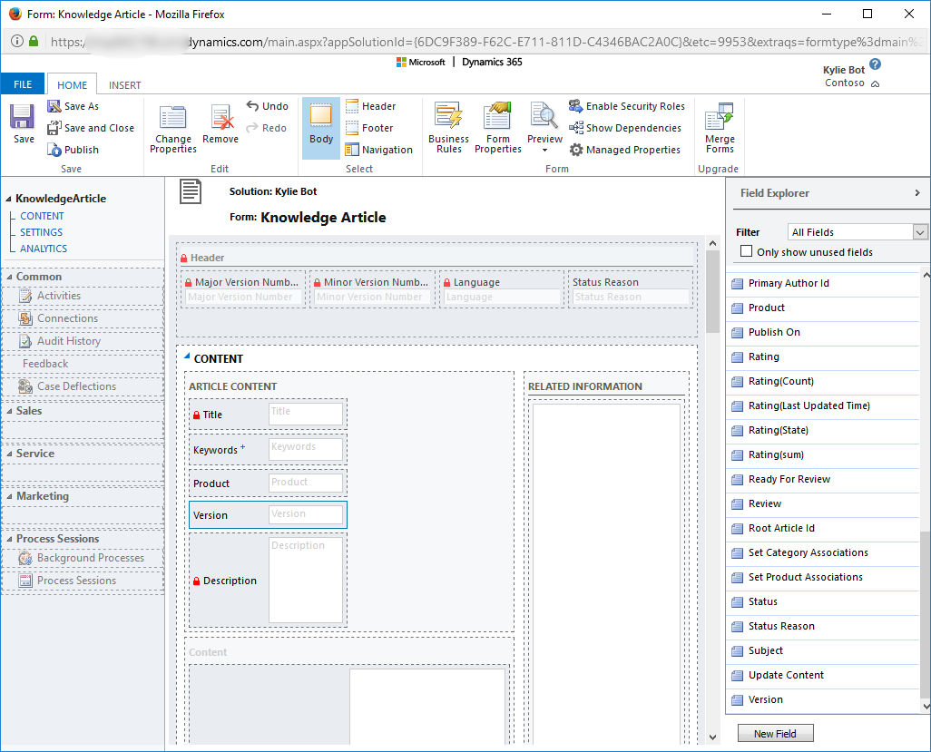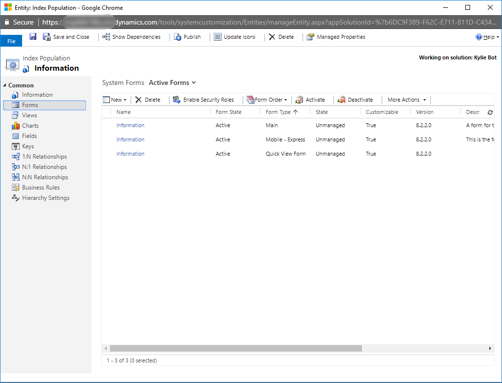 Here, you should have a solution called ‘KylieBot’ or similar from where we have been making our changes to our Dynamics 365 Customer Engagement instance. The original solution came from this blog post. Your screen should look like this: