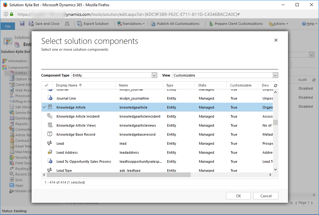 On last thing to do, is to add some fields to the Knowledge Article entity that already exists in the system. To do this, click on the ‘Add Existing’ button and then select the Knowledge Article entity like this: