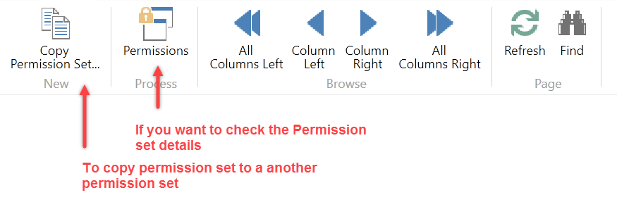 Below is the ribbon of the "Permission Sets by User" control center and it allows to copy a permission set to a new permission set and also to view the detailed version of permissions.