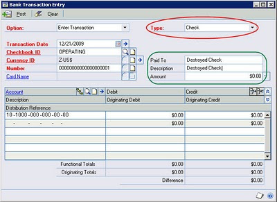 Occasionally, you have a payables check or checks that for one reason or another gets lost or destroyed. How do you log that check in the system so you have a complete audit trail of all checks? Here's one way, compliments of fellow MVP Leslie Vail -