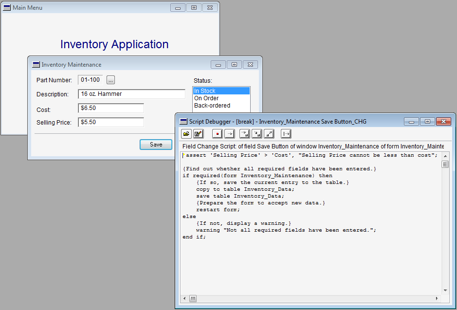 Note that an assertion will not prevent the values entered from being saved, but Dexterity will provide the option of aborting the script execution, ignoring the assertion, or debugging the current code to examine other alternatives. For the example above, the developer can choose to implement additional code that will prevent the saving of a record if indeed the selling price must be always greater than the item cost.