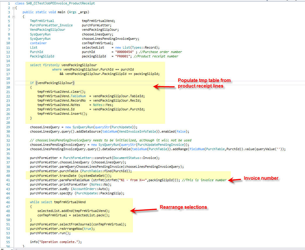 Microsoft Dynamics 365 for Finance and Operations, Enterprise edition : X++ code to post Purchase order invoice by matching a product receipt