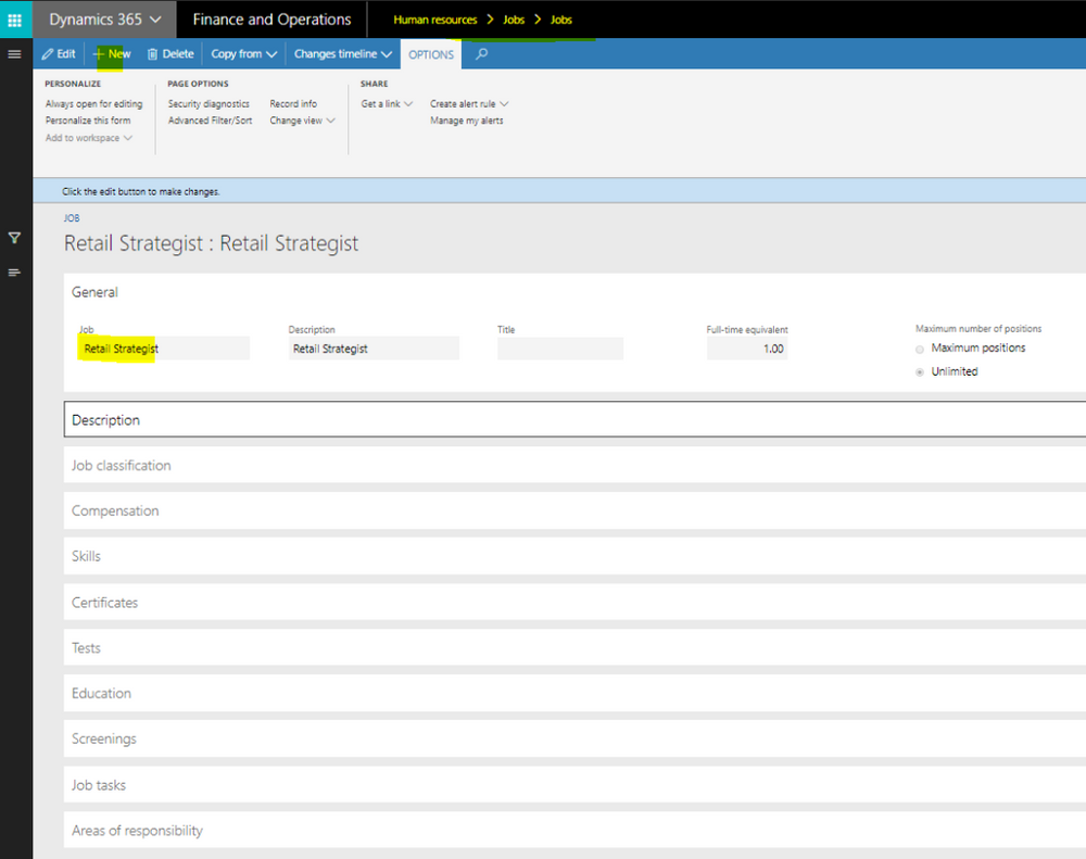 As a next step, we create a job and a position. We assign the job to the position. A position is an individual instance of a job. For example, the position, “Sales manager (West),” is one of the positions that is associated with the job, “Sales manager.” A position exists in a department and has only one worker associated. Note: the job will be later referenced in the job rule in the spending/signing limit policy.