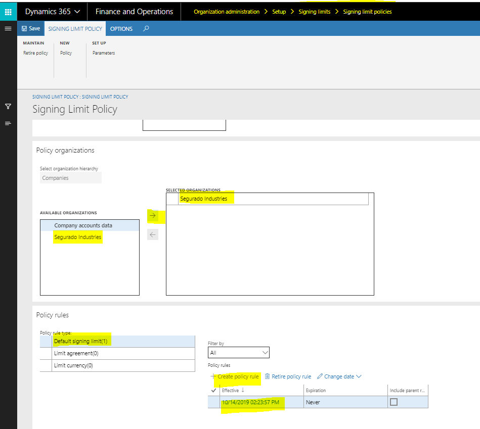 Navigation path: Organization administration/Signing limits/Signing limit polices.