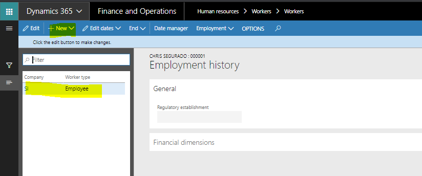 To be able to create PRs, we additionally need an employee record for our worker above. We can add an employee record for a specific or all LEs from the Worker form under "Employment history".