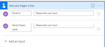 Step 4) Add a input for your button flow. In my case I am adding two text inputs one for parcel id and another for parcel shipper.