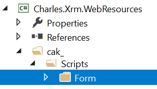 3. Add a new sub-folder under the prefix folder (cak_) and name it Scripts. This folder will contain all the JavaScript files used on the form and the ribbon