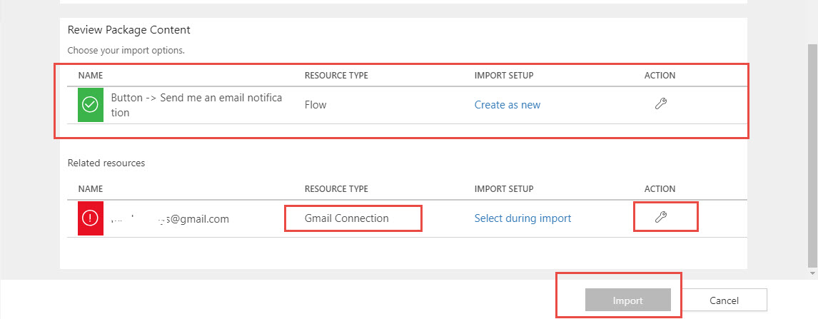 Step 5) Details of package will be available and you will see resource type gmail will be in red sign. that's why import button is disabled. Click on configure button for adding resource type gmail.