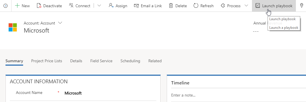 When I publish the Playbook template and open an Account form, the button ‘Launch playbook’ is shown.