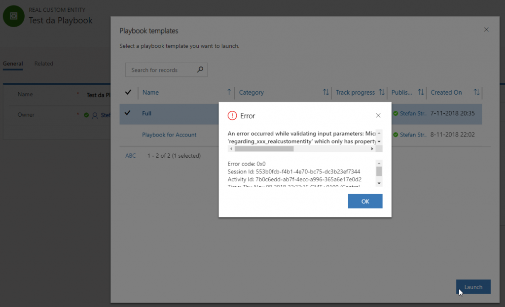 Somehow the Playbook service should check whether the targeted entities are enabled for Activities, that’s all. Besides that just give us a plain Regarding lookup without the current restrictions. In the Playbook form there is this fancy Regarding lookup with views of the five Sales entities.