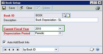 For instance, let's say you're closing 2009 and you accidentally close 2010 also. At that point, the Current Fiscal Year field will reflect 2011. Just change the Current Fiscal Year back to 2010. You'll now be able to post depreciation into your 2010 periods. The Current Fiscal Year determines whether depreciation is to posted to the current year (depreciation expense account), or a prior fiscal year (prior-year depreciation account).