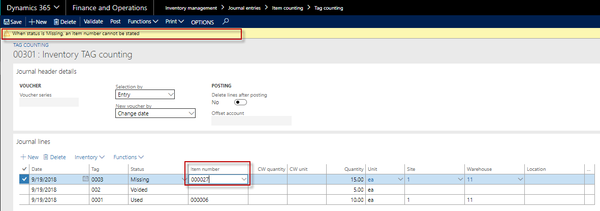 - Used - The item number is counted for the tag. This line is then transferred to counting journal upon posting of tag counting journal