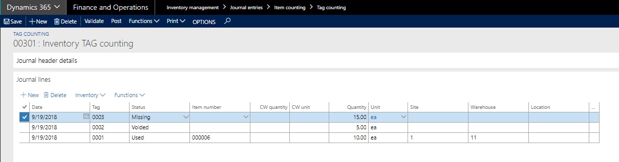 Tag counting journal facilitates the entry of each tag and information on it in the journal lines which is upon posting transfers to counting journal.