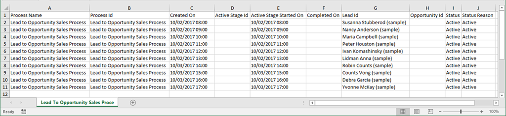 This image shows an example import file for populating the Lead to Opportunity Sales Process entity.