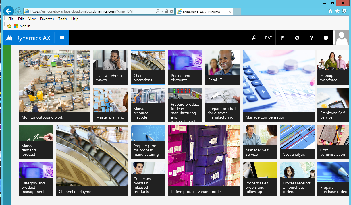 - And that's it - you should be logged into the AX7 home page now. And should see something like the below (mine is "Dynamic 'AX 7' Preview VM, atm).