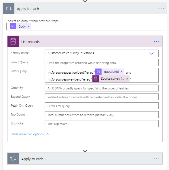 msfp_sourcequestionidentifier eq '@{items('Apply_to_each')['questionId']}' and msfp_sourcesurveyidentifier eq '@{triggerOutputs()?['body/msfp_sourcesurveyidentifier']}'