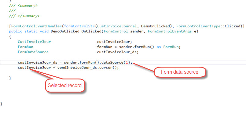 5. Now the question is, how we will get the selected record on that form or how would we get the form data source, if you take a look of this above method, you will seen we have a formContol as a parameter and by using that we can get the form data source and selected records.