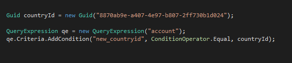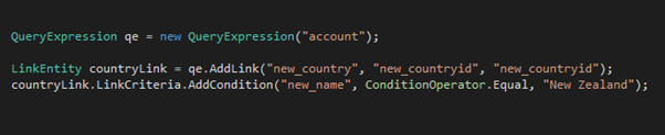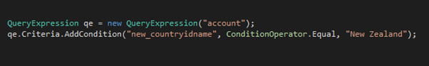 In CRM if we want to filter a query using a particular lookup value, e.g. if you had a lookup to Country and you wanted to query all Accounts where the Country is New Zealand, you could achieve this in a couple of different ways.