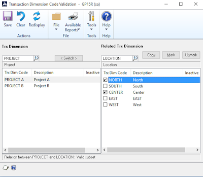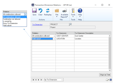 On this window, you pick the dimensions one by one and define the assignment rules for this specific dimension as related to other financial dimensions. The assignment rules are; as derived from the Dynamics GP Help File:
