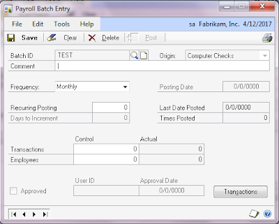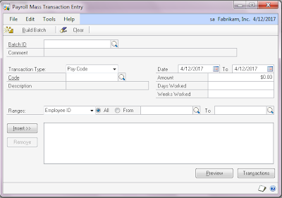I think this has to be one of the most underutilized windows in Dynamics GP. Enter or select a Batch ID to be used for the transactions. Then select a pay code, deduction, or benefit and enter a date range and range of employees by employee ID, class, department or position . You can enter an amount if applicable, or leave it set to zero and you can edit them individually in the standard payroll transaction entry window. You can then preview the transactions to be created (the system will only create transactions for employees in the range who are already assigned to the selected code) and delete the transactions that should not be created. In the Preview Mass Entry Transactions window, click Build Batch to create the transactions. You can then edit the transactions, including the amounts using the standard Payroll Transaction Entry window.