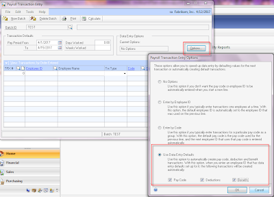 Ever wonder what the Data Entry Default option on Cards>>Payroll>>Deduction (and Setup>>Payroll>>Deduction) means? Well, it comes in to play quite nicely on pay codes, deductions, and benefits that require transactions (in the case of benefits and deductions, the Transaction Required option must be marked). In Payroll Transaction Entry, click on the Options button in the Data Entry Options section and choose "Use Data Entry Defaults" and select which records to default. Then when you select an employee in the Payroll Transaction Entry scrolling window, the records that are marked as data entry defaults will automatically appear. This is a great option when you generally enter the same transactions for employees each time, and the amounts vary. For example, if you manually key timesheets in to the system, you could set up both the hourly and overtime pay codes as data entry defaults and then you only need to select the employee to create the transactions and then enter the amounts.