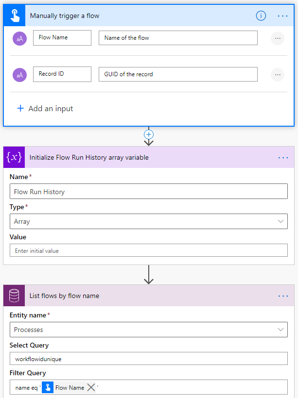 The sample solution flow is triggered manually but you can extend it and set it up as a recurrence flow and have it notify you any failures in a shorter timeframe (e.g. hourly) for mission-critical flows instead of relying on the weekly emails. The first parameter is the name of the flow and the second one is the GUID of the record. You can get the GUID of the record by using the "Record ID" action from the Level Up browser extension by Natraj Yegnaraman or copy the GUID value after "id=" parameter in the URL in Unified Interface.