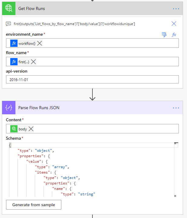 first(outputs('List_flows_by_flow_name')?['body/value'])?['workflowidunique'] The Parse JSON action is used in the next step to process the output of the custom connector and use in the upcoming steps.