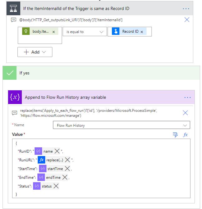 items('Apply_to_each_flow_run')?['properties']?['trigger']?['outputsLink']?['uri']4. Add flow run URL into array variable if the trigger is related to the record
