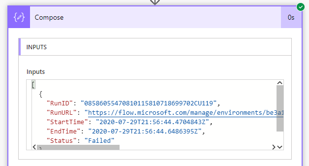 The end result of the array variable will look like this. The flow run URL can be opened by Ctrl + clicking on the URL in the Compose step for one-time troubleshooting purpose. You can also extend this solution further by using Create HTML Table action and email to yourself or post a message to a channel in Teams.