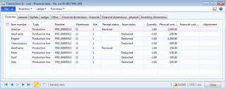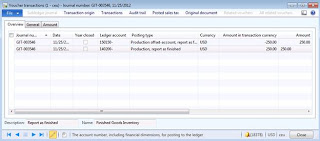 Costing Costing amount 376.09$ reflects the actual cost of production order which includes material consumption, labor consumption and various overheads applied *Inventory transactions All inventory transactions related to Car frame (AlexFrame) production order will be displayed on Voucher transactions screen for costing *Voucher transactions Ledger voucher provides details on which account was credited for "Production issue" and which account was debited for "Production offset account issue". Similarly which account was credited for "Production offset account receipt" and which account was debited for "Production receipt". Cost adjustment is reflected in "Production substitution variance" posting. Please note that when production order was ended the system reversed all previous postings for WIP (Work in process) including material consumption, labor consumption and all applied overheads |