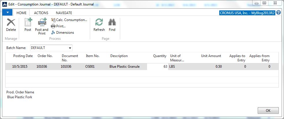Next we post the consumption. Same here; we can enter the total quantity consumed against the first line and Dynamics NAV will later allocate the costs according to the percentages.