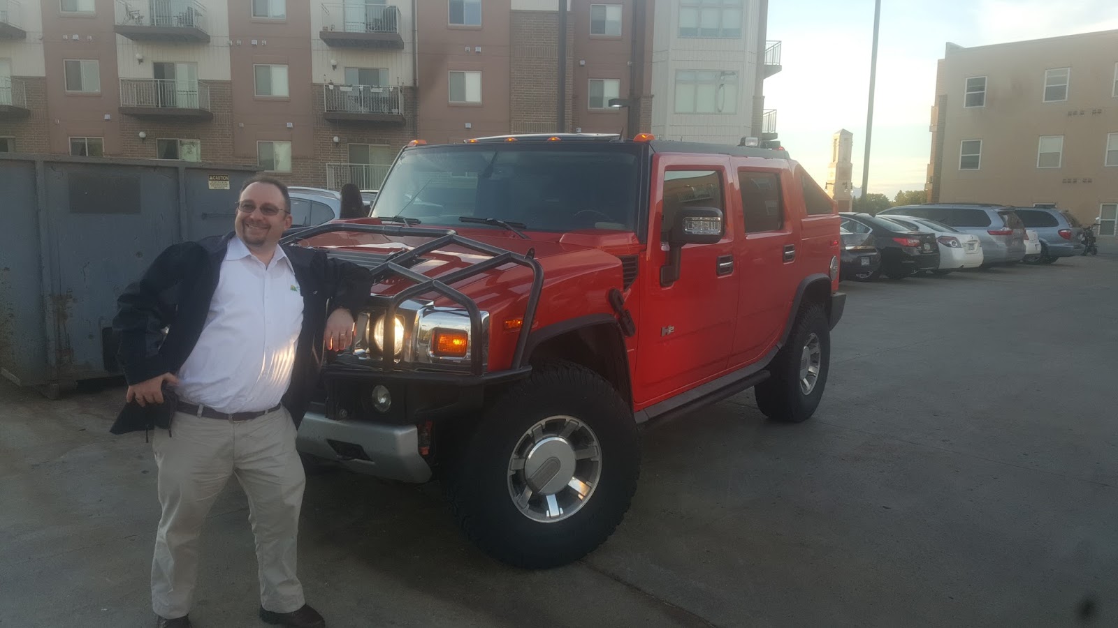 On the way out to the pub crawl, David decided he needed to have a picture with Jay's Hummer H2, on the parking deck.