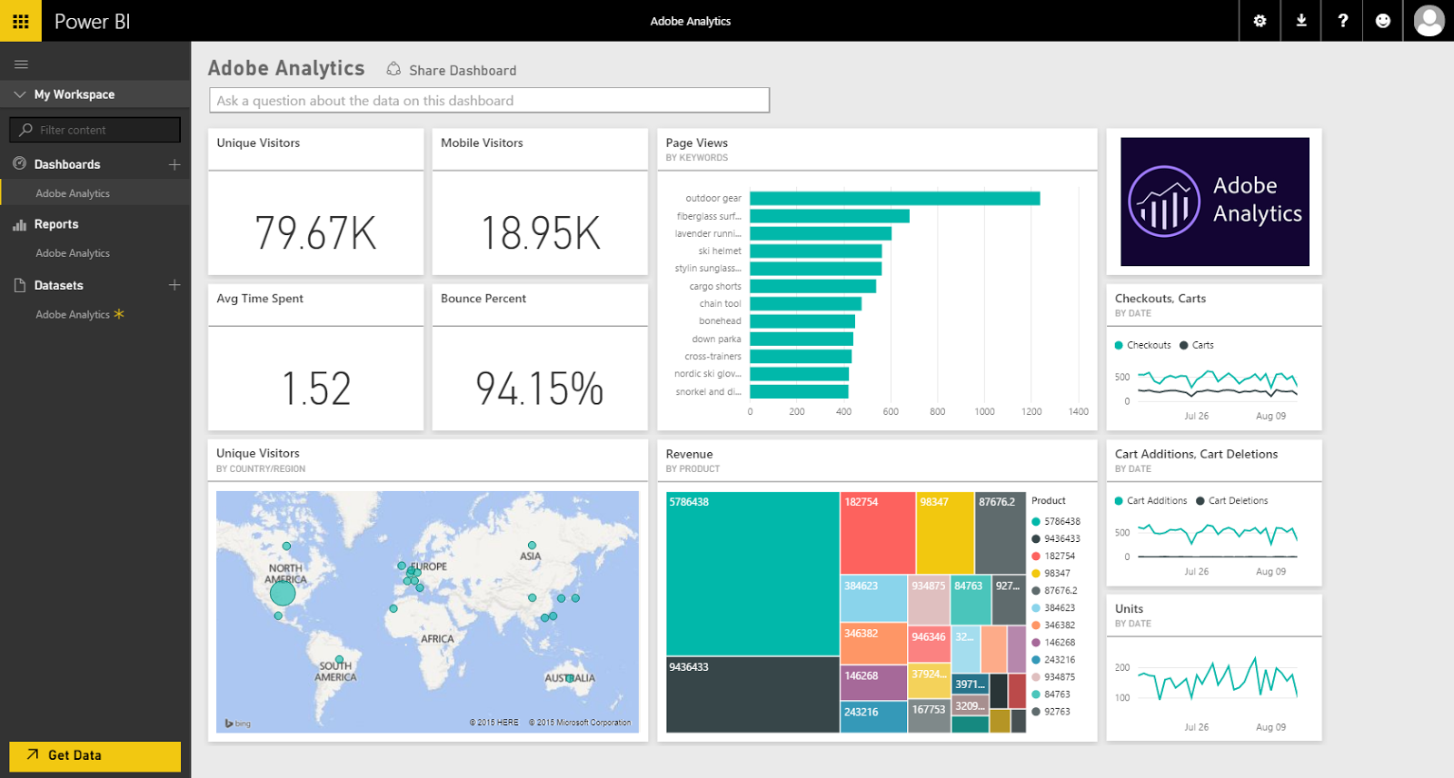 Microsoft Power BI offers connectivity to Adobe Analytics through the Microsoft content pack. This means you can create dashboards and visualizations with Power BI that consume data from Adobe Analytics, as shown below.