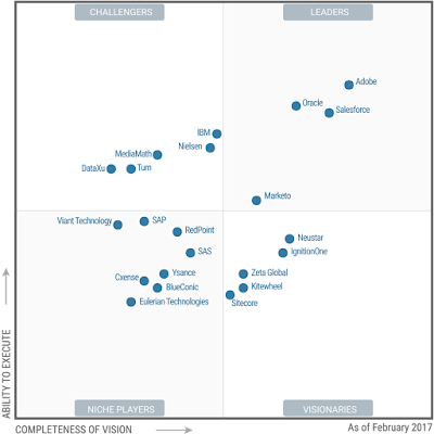 Because Microsoft was unable to gain significant market share with it's Dynamics Marketing product, Adobe provides a lifeline to relevance for Dynamics in the online marketing arena. Microsoft is not shown in the following Gartner "magic quadrant" matrix, but Adobe is in the strongest position: