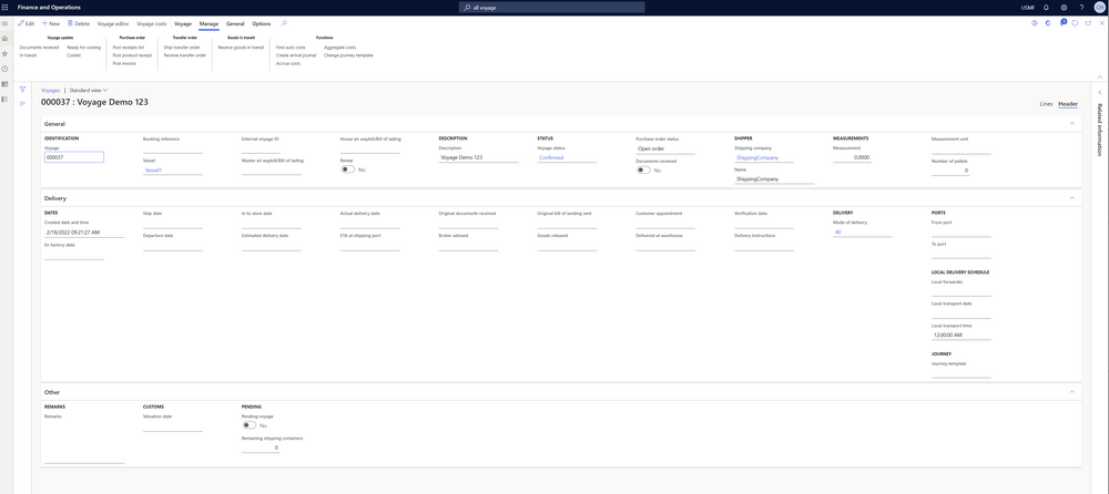 As a next step, we can maintain information such as Bill of lading or Master Bill of lading, Measurements and Measurement units (e.g. weight), Departure time, Estimated delivery date, Actual delivery date, ETA at shipping port, Date when original documents are received, Broker advised date field, Goods released date, Verification date, etc. on the voyage itself and track the voyage with dates for each of the logistical steps (legs) it goes through. In our case it is simply point to point to keep things simple. Additionally, there is a remarks field what can be used free text. (if required) A user can use document handling to attach emails or documents to the voyage if needed.
